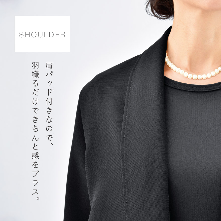 肩パッド付きで、肩のラインが整い、羽織るだけできちんと感をプラス。立ち姿も美しく決まります。