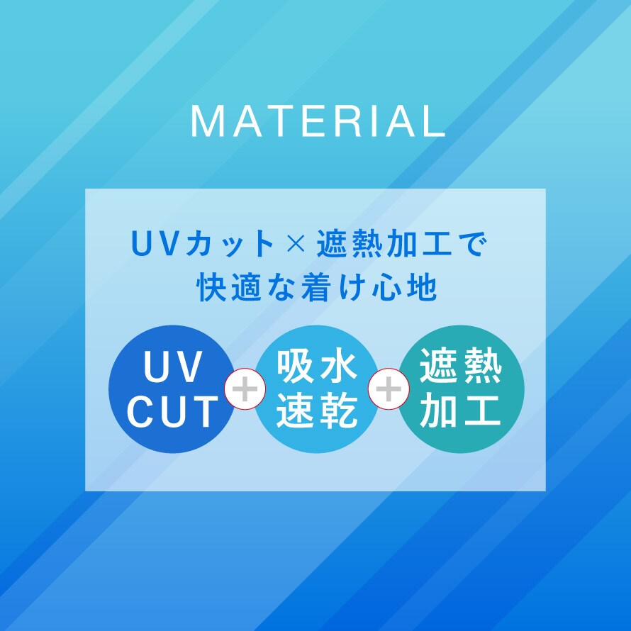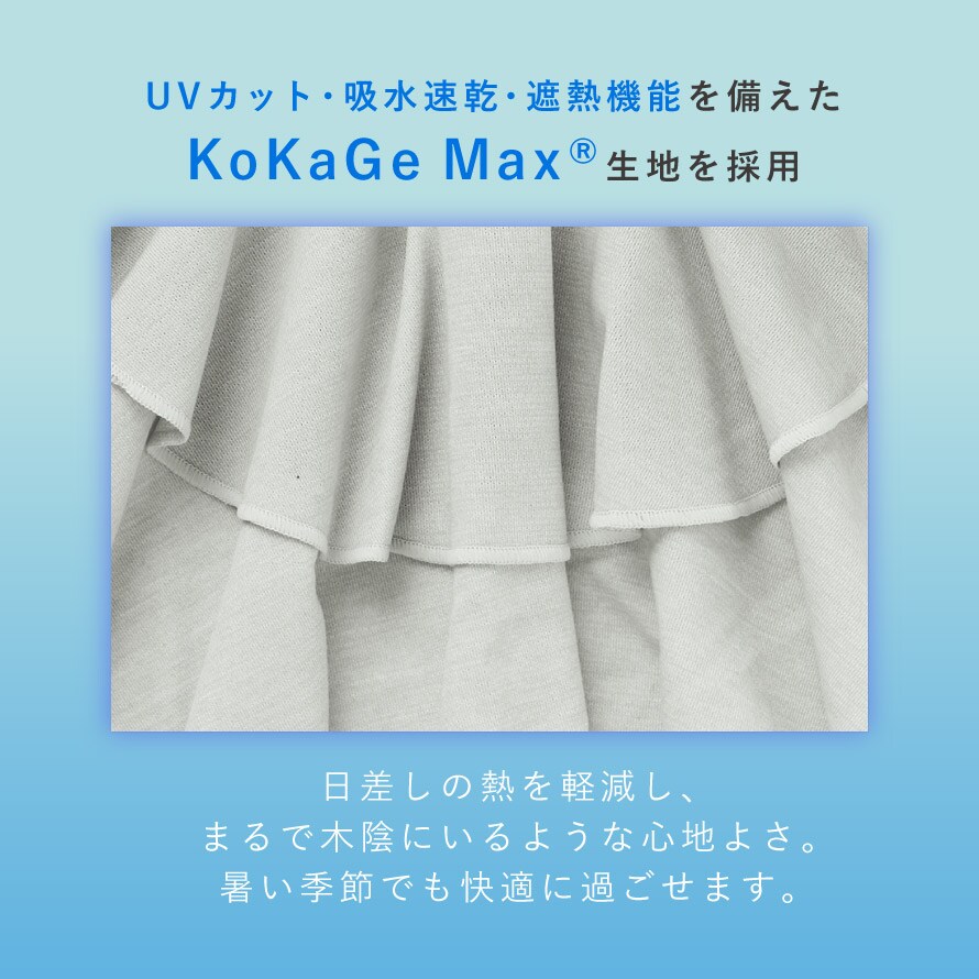 吸水速乾・UVカット(UVカット率95%以上)・遮熱機能を備えた「KoKaGe Max(R)」生地を採用。日差しの熱を軽減し、まるで木陰にいるような心地よさ。風を通しやすいメッシュ素材を使用し、暑い季節でも快適に過ごせます。