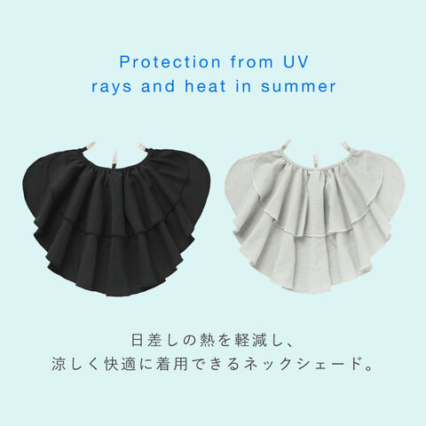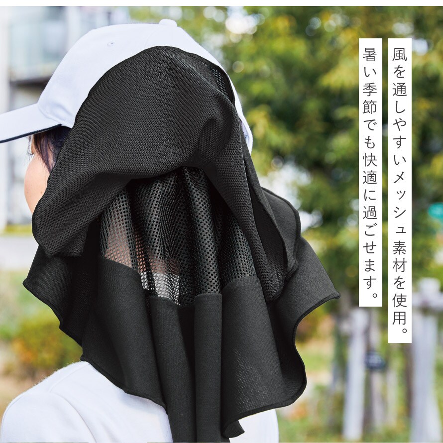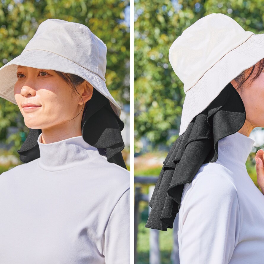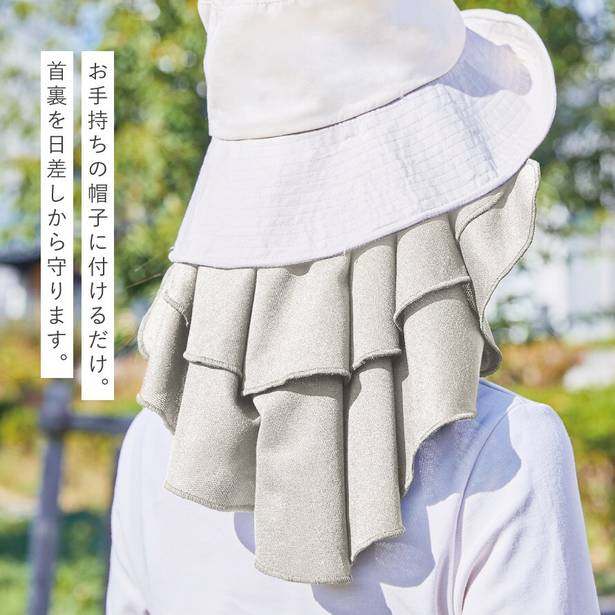 お手持ちの帽子に付けるだけで、首裏を日差しから守る便利なネックシェード。強い日射しの下でも安心してお出かけできます。