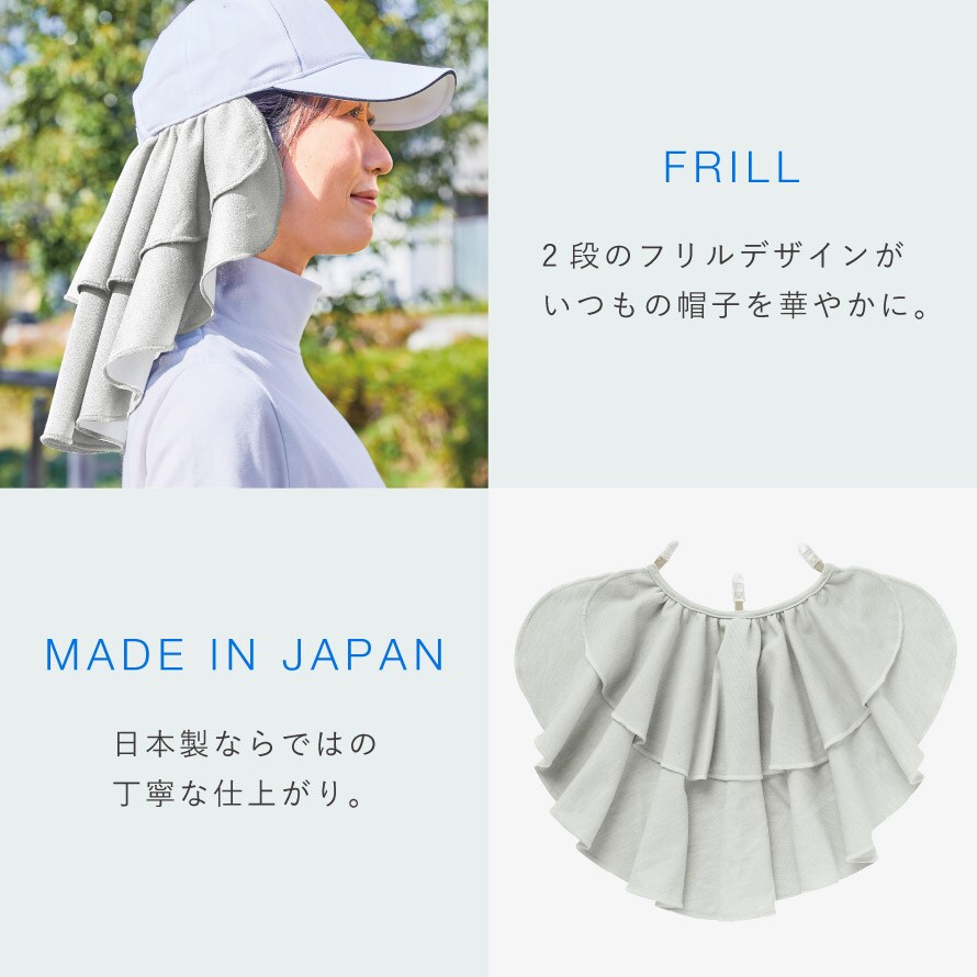 2段のフリルデザインで、いつもの帽子を華やかにアレンジ。実用性だけでなく、後ろ姿まで上品に演出します。