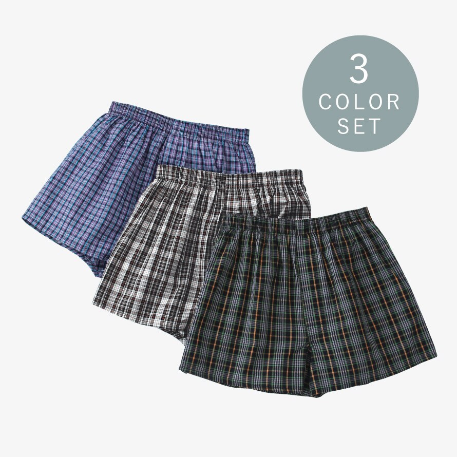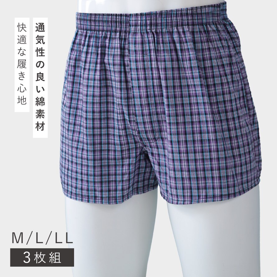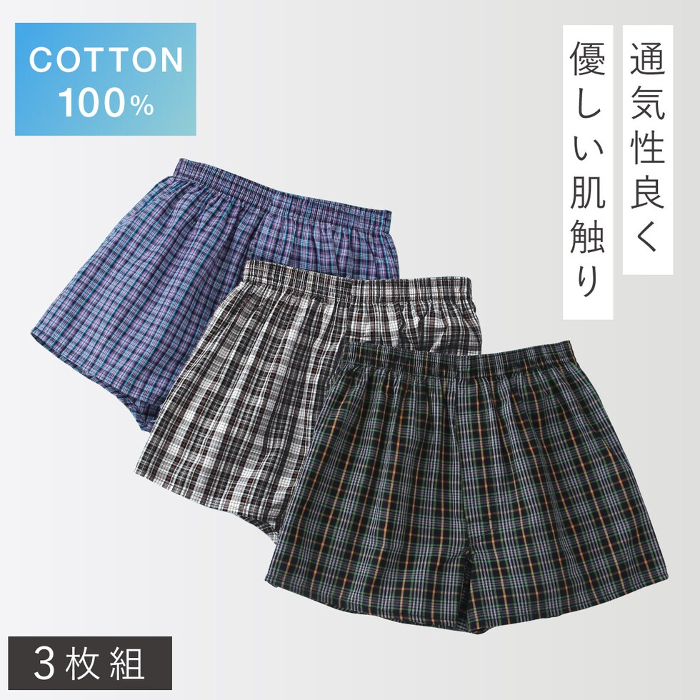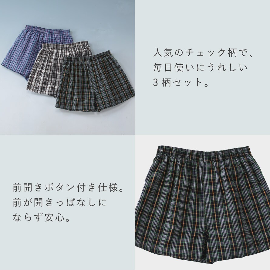 綿100% メンズトランクス 前開きボタン付き 3枚セット チェック柄 通気性◎ 蒸れにくい 紳士用 下着 M L LL まとめ買い 男性用