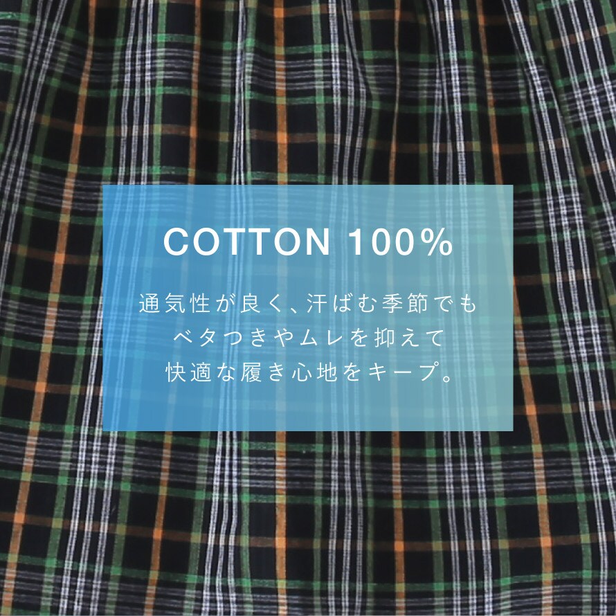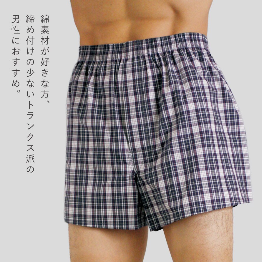 こちらは、綿100%で肌ざわりがやさしいメンズトランクスです。通気性が良く、汗ばむ季節でもベタつきやムレを抑えて快適な履き心地をキープします。