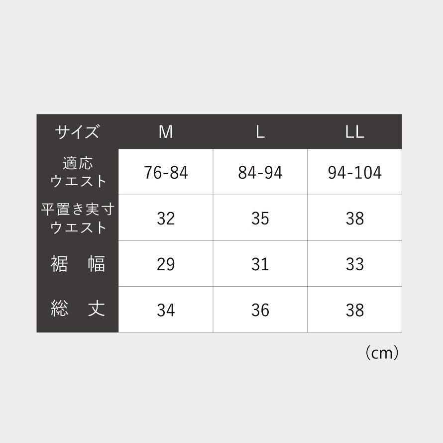 | サイズ | M/適応ウエスト76-84、裾幅29、総丈34、L/適応ウエスト84-94、裾幅31、総丈36、LL/適応ウエスト94-104、裾幅33、総丈38cm |