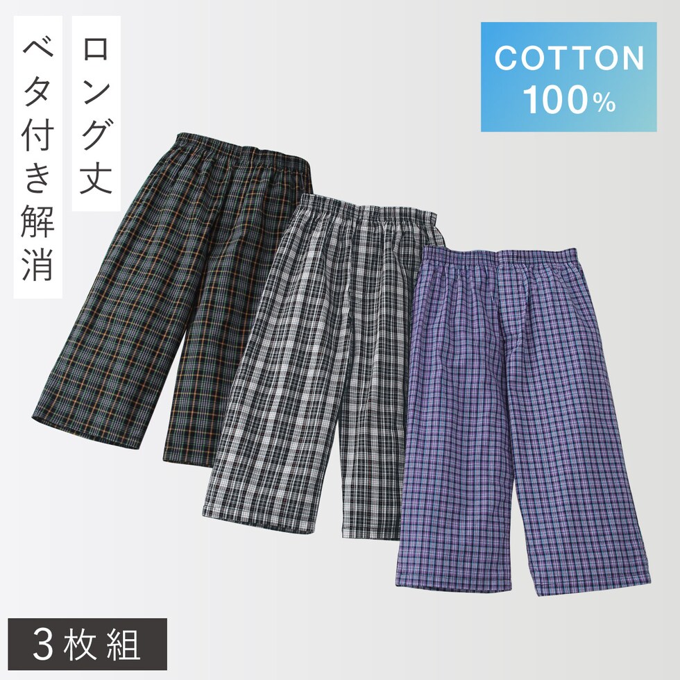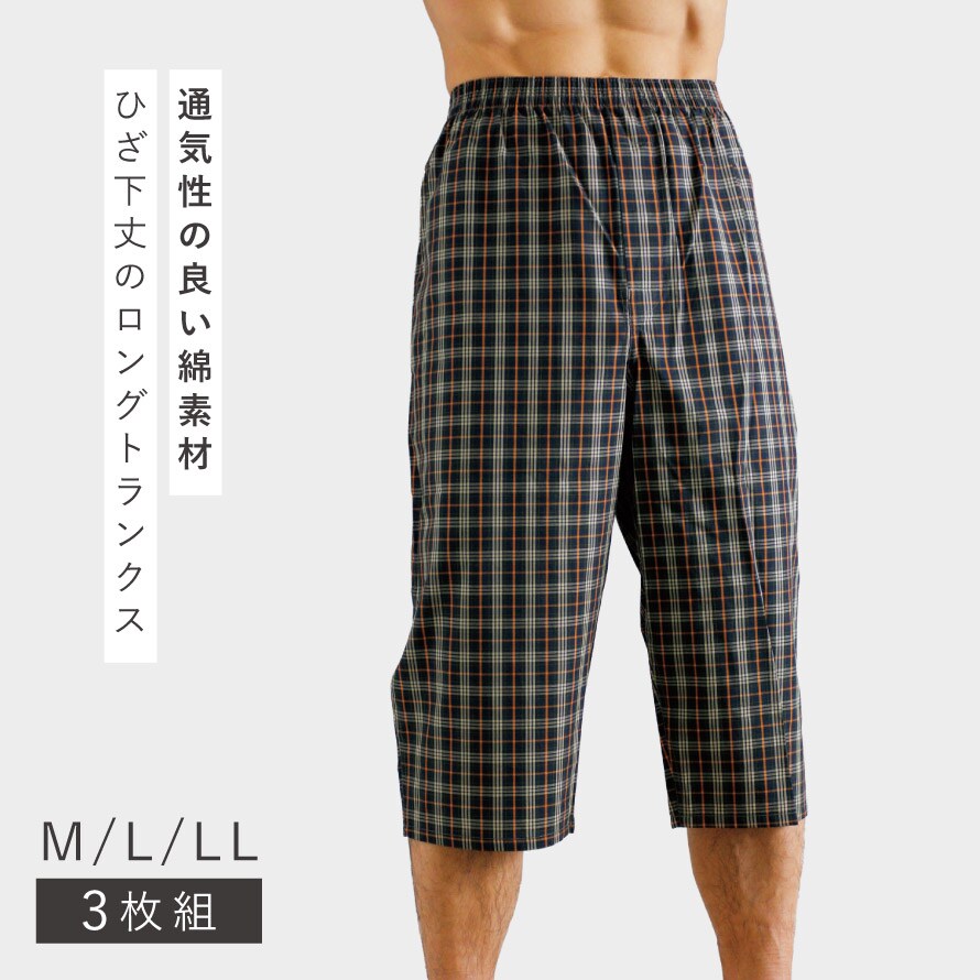 綿100% ロングトランクス メンズ ひざ下丈 前開きボタン付き 3枚セット 蒸れにくい ゆったり 紳士下着 M L LL 綿100%先染めロングトランクス 3柄組 まとめ買い