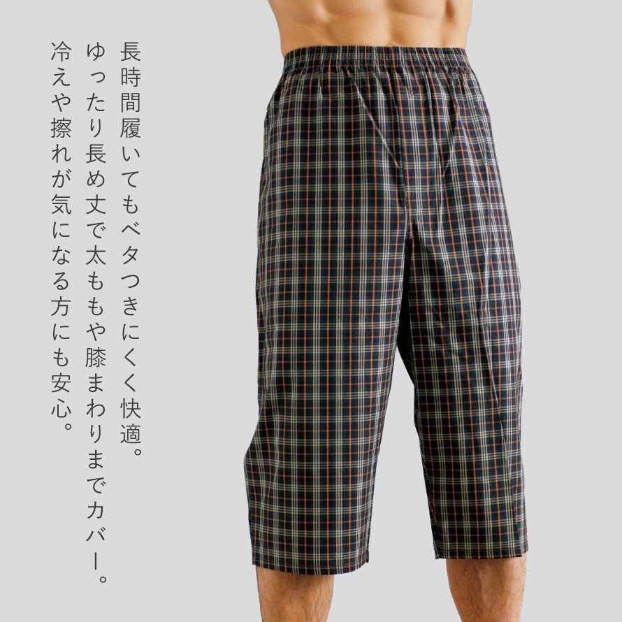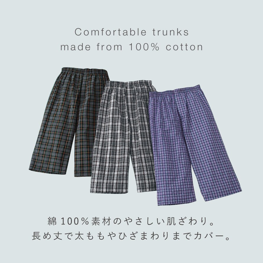 綿100%素材のやさしい肌ざわりで、長時間履いてもベタつきにくく快適な、ひざ下丈のロングトランクスです。ゆったりとした長め丈は太ももやひざまわりまでカバーし、冷えや擦れが気になる方にも安心。蒸れやすい季節や汗ばむ日もサラッと履けるのが魅力です。