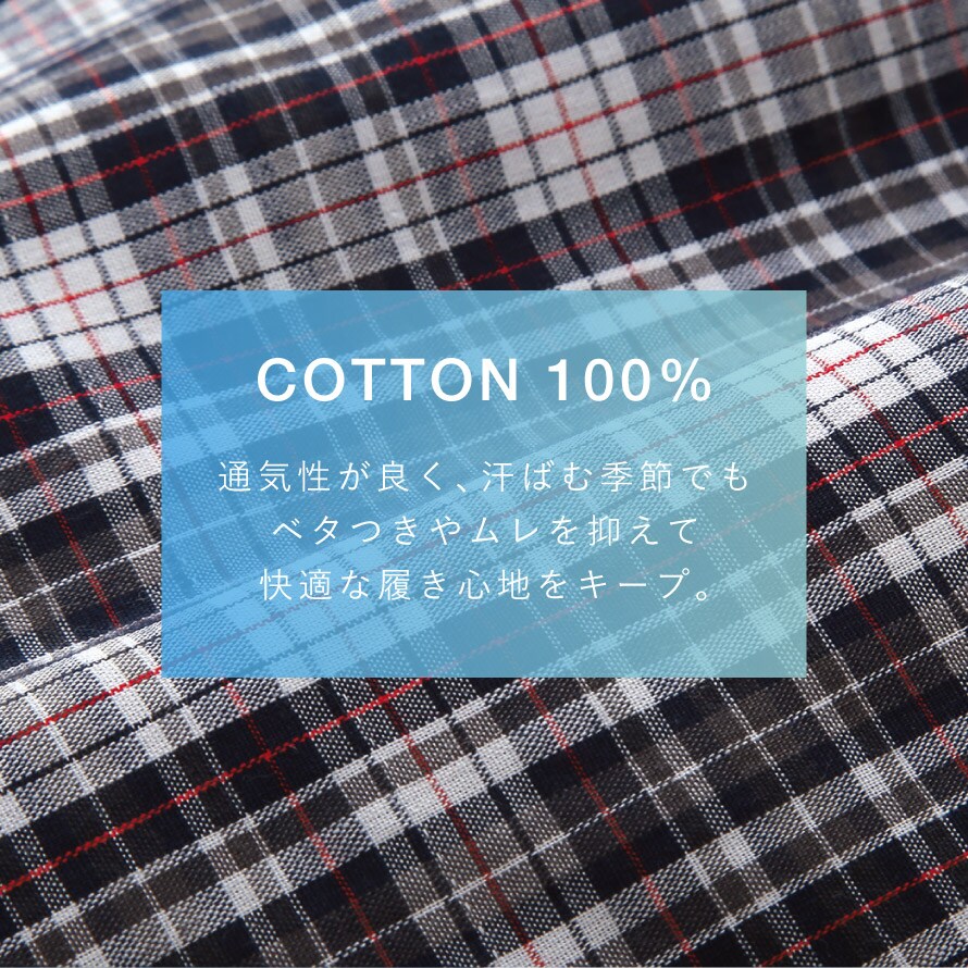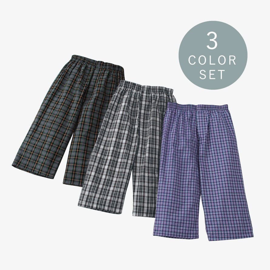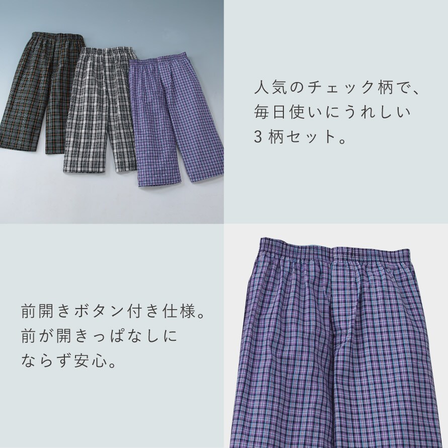 前開きボタン付き仕様で、外出時や就寝時も「開いてしまう心配がない」と好評。シンプルで清潔感のあるチェック柄で、年齢を問わず身につけやすいデザインです。