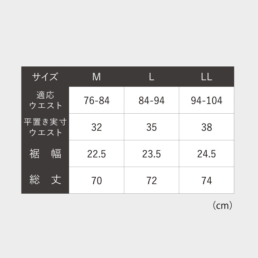 | サイズ | M/適応ウエスト76-84、裾幅22.5、総丈70、L/適応ウエスト84-94、裾幅23.5、総丈72、LL/適応ウエスト94-104、裾幅24.5、総丈74cm |