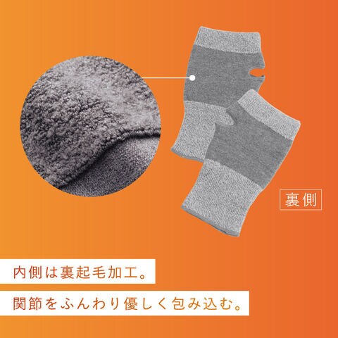 内側は裏起毛でポカポカあったか。手首や関節をふんわり優しく包み、しっかりフィットします。