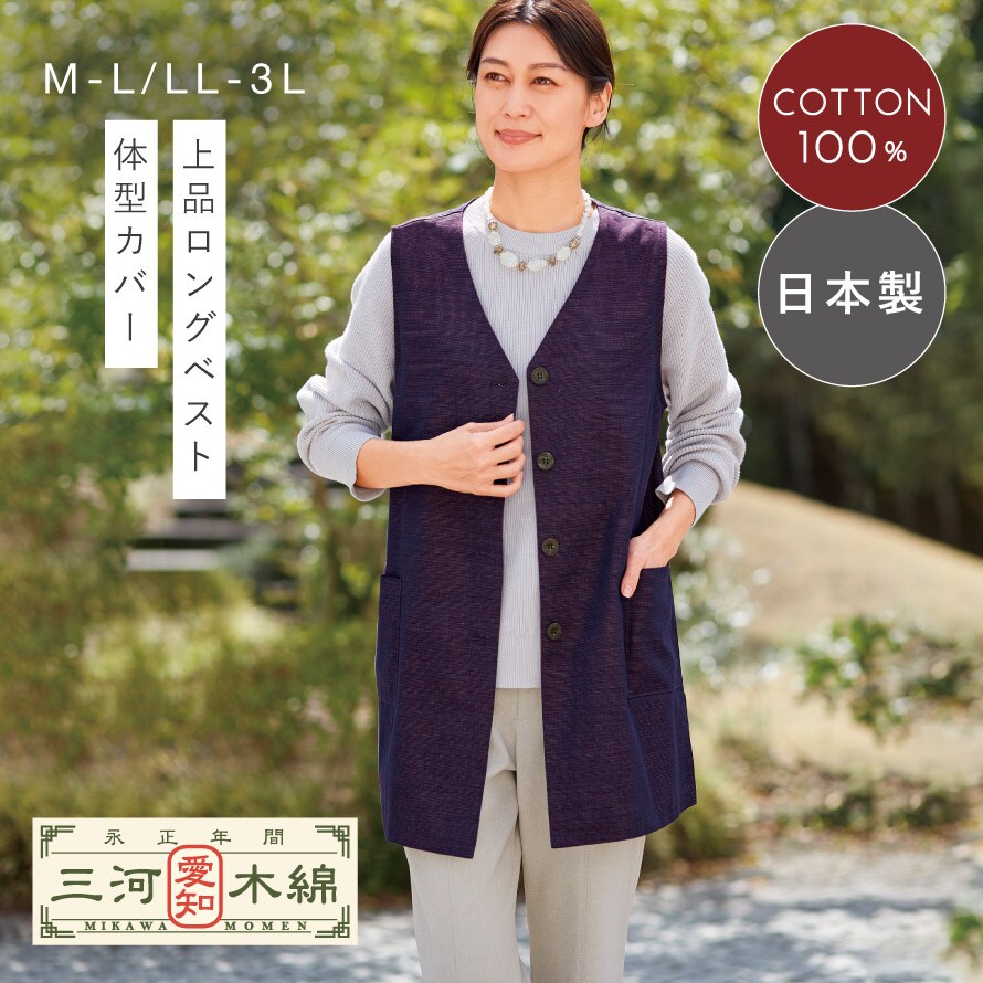 サイズは M-L / LL-3L、カラーは ネイビー・パープル・ピンク の3色展開。シニア世代の毎日に寄り添う、上品なロングベストです。