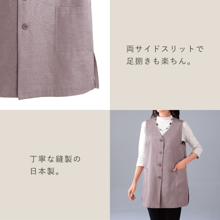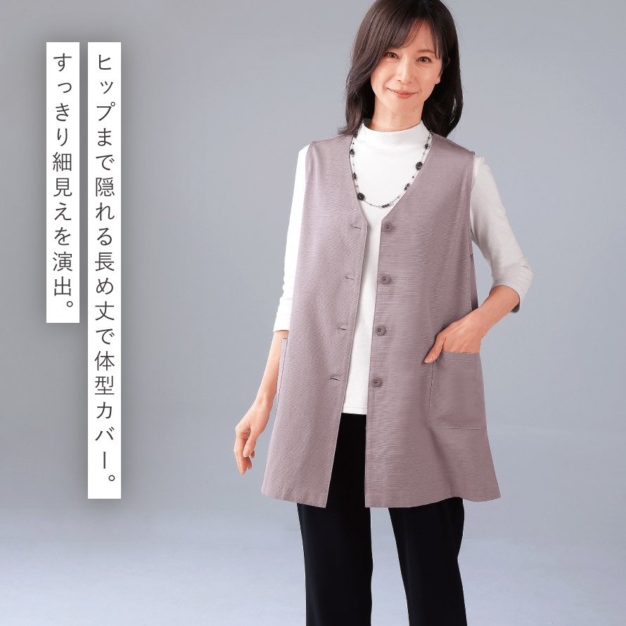 羽織るだけで、縦ラインを強調して、すっきり細見えを演出するロングベスト。気になるお腹周り、お尻をカバーする丈感です。両サイドスリットで足捌きも楽ちん。