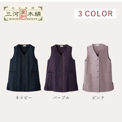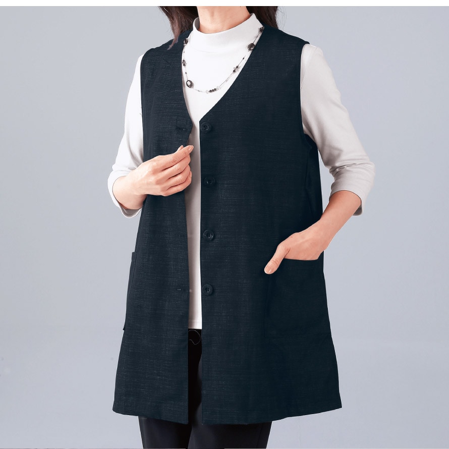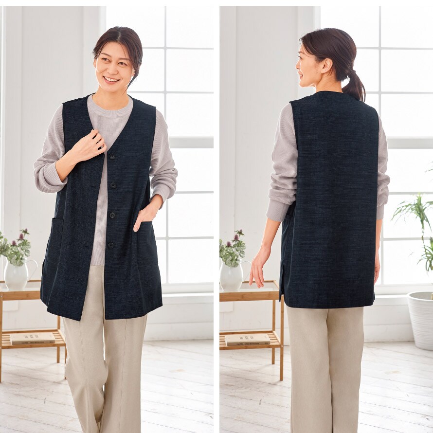 伝統的な織物「三河木綿」使用。縦長でシルエットがすらっと見えるロングベスト。