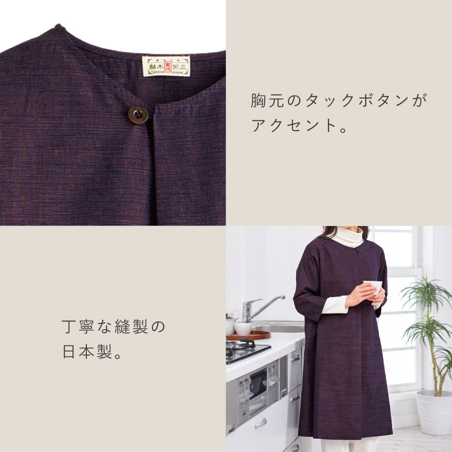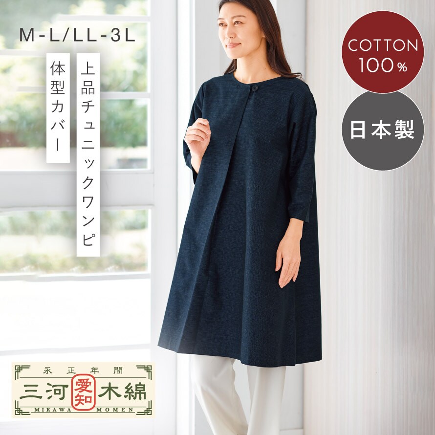 伝統的な織物「三河木綿」使用。ゆったり着こなせるAラインのチュニックワンピ。
