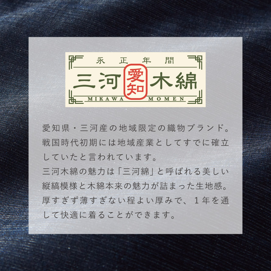 愛知県・三河産の地域限定の織物ブランド。戦国時代初期には地域産業としてすでに確立していたと言われており、明治時代に量産が可能になると、全国に知られるようになりました。三河木綿の魅力は「三河綿」と呼ばれる美しい縦縞模様と木綿本来の魅力が詰まった生地感。