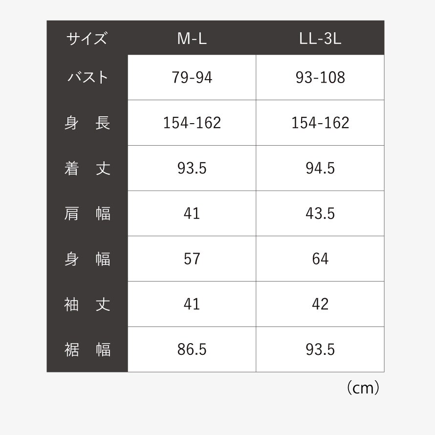 | サイズ | 身長154-162、M-L/バスト79-94、着丈93.5、肩幅41、身幅57、袖丈41、裾幅86.5、LL-3L/バスト93-108、着丈94.5、肩幅43.5、身幅64、袖丈42、裾幅93.5cm |
