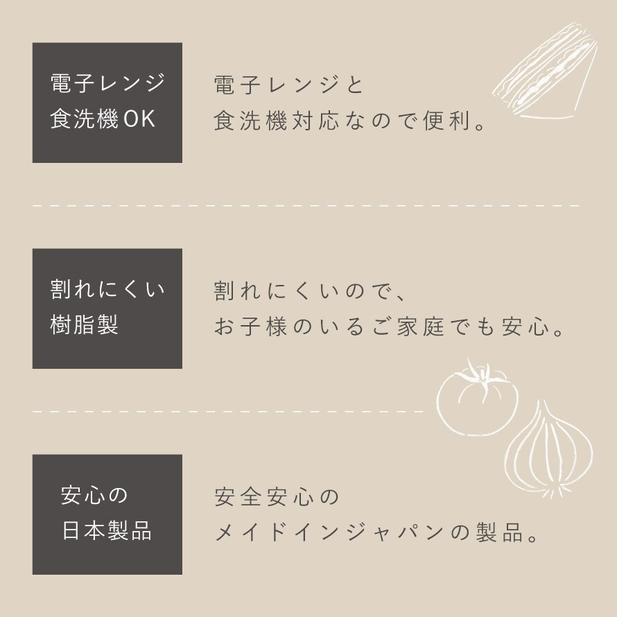 樹脂製なので、食洗機対応で電子レンジの使用が可能。割れにくく、また手で持っても熱くないので、お子さまのいるご家庭でも安心して使って頂けます。