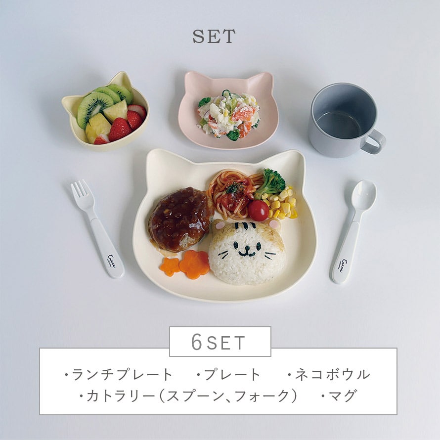 愛らしい猫のモチーフで思わず微笑んでしまう「Catteシリーズ」。ギフトにもぴったりのランチプレート、プレート、ボウル、マグ、スプーン、フォークの6点セット。