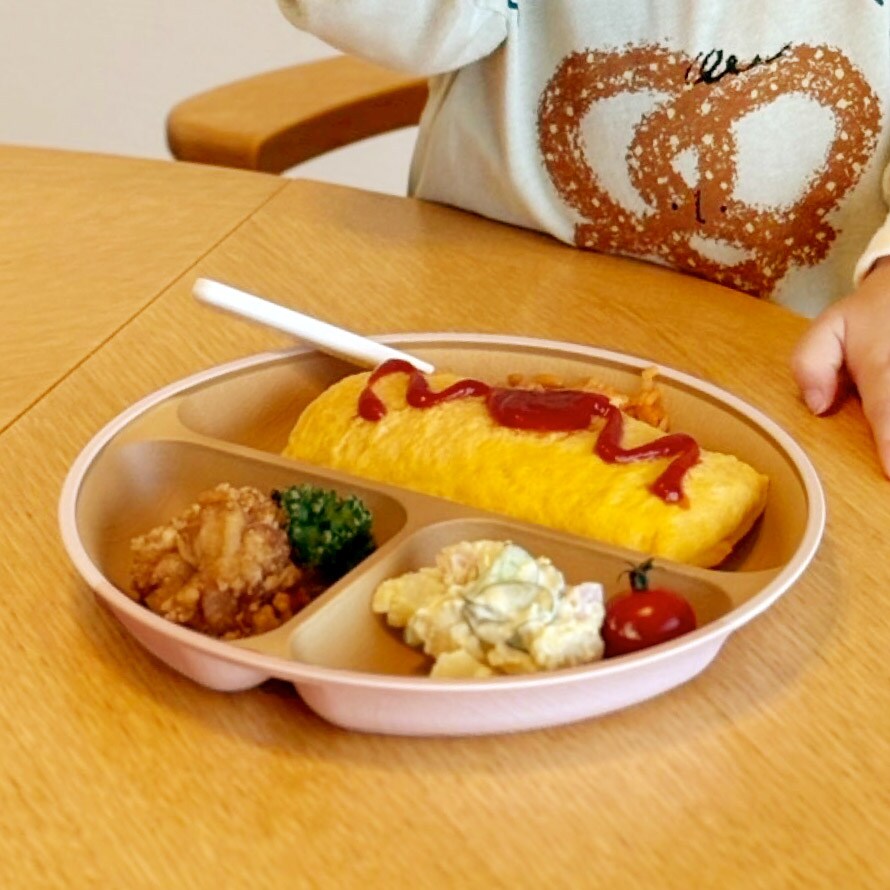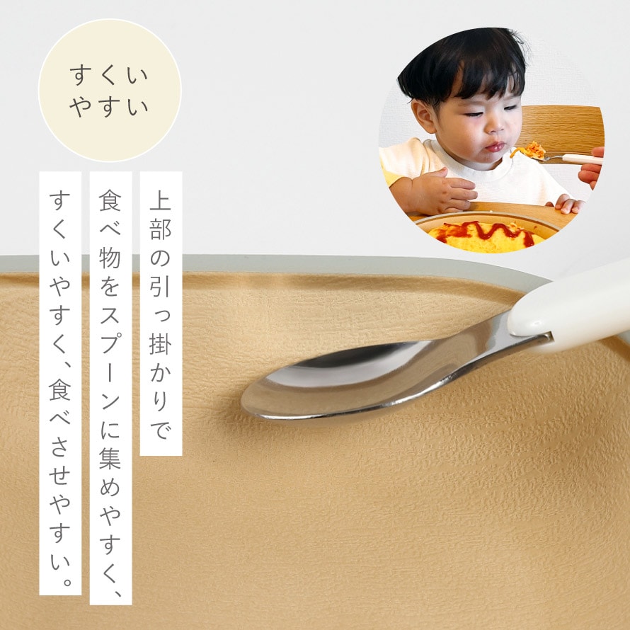 仕切り付きのワンプレートは、上部の引っ掛かりで食べ物をスプーンに集めやすく、炒飯やごろっと野菜もこぼさず食べやすい設計。ワンプレートでバランス良く食事を楽しめます。