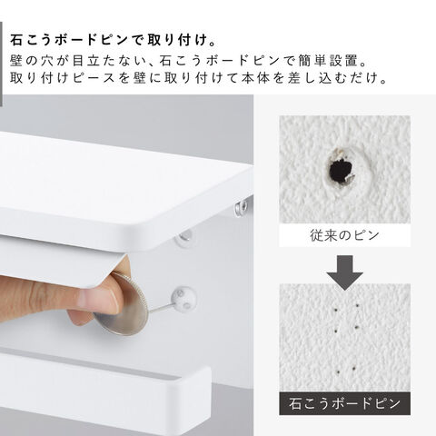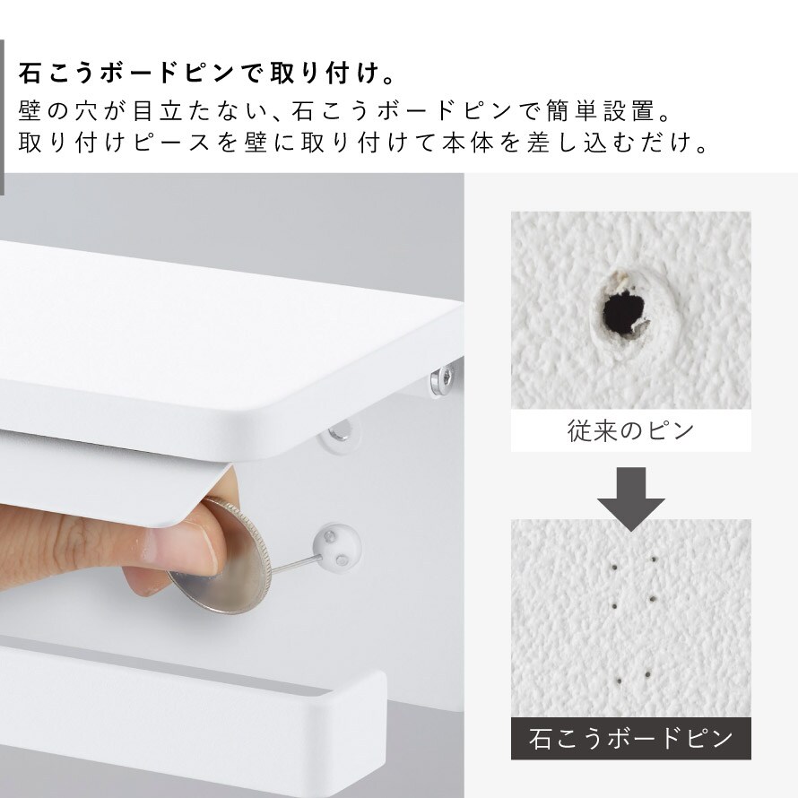 穴が目立たない石こうボードピンで、取り付けピースを壁に取り付け。本体は取り付けピースに掛けるだけ。石こうボードピンは、従来のピンよりも穴が小さく壁の穴が目立ちにくくて◎。木ネジでの取り付けもできます。