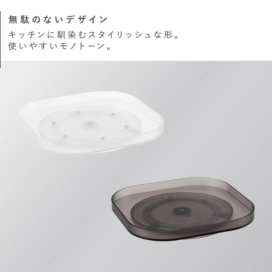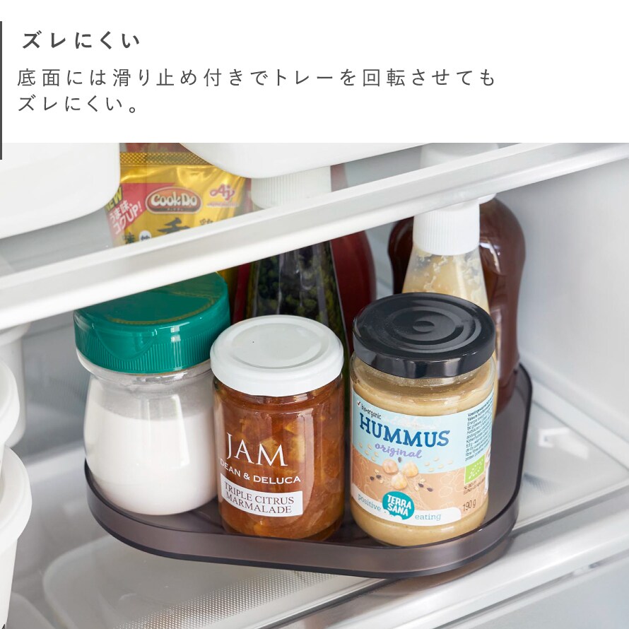 奥にある物も回転させることで楽に取り出すことができ、底面には滑り止めがついているのでトレーを回転させてもずれにくく安心です。