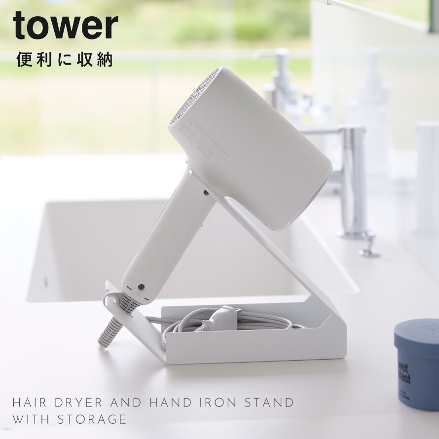 【ポイント5倍】収納付きドライヤー&ヘアーアイロンスタンド タワー 山崎実業 tower ドライヤー ハンズフリー スタンド 固定 ドライヤースタンド おしゃれ モノトーン ホワイト ブラック 1334 1335