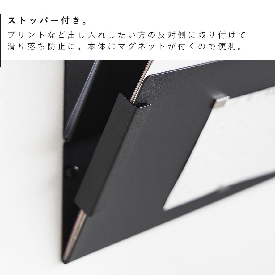 書類の滑り落ちを防ぐマグネットストッパー付き。