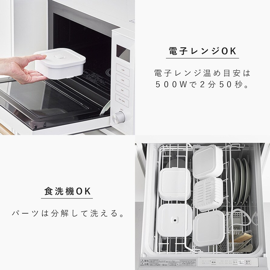 容器・ザル・蓋は凹凸が少なく洗いやすい設計で食器洗い乾燥機にも対応しています。