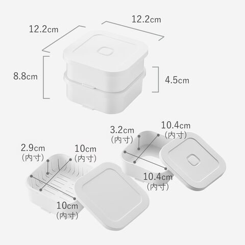 | 内寸サイズ | 容器/幅10.4×奥行10.4×高さ3.2cm ザル/幅10×奥行10×高さ2.9cm |