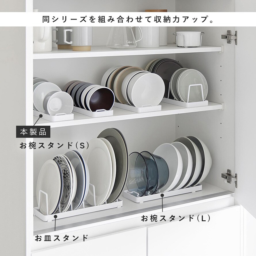 同シリーズには、どんぶりやサラダボウルなどのおおきめの器を収納できるスタンド(奥行11cm)Lサイズや、中皿や大皿にちょうど良いお皿スタンドもございます。