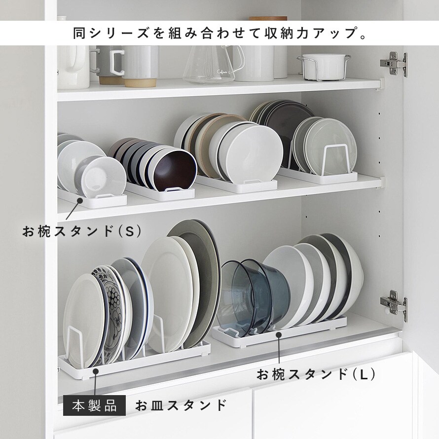 同シリーズには茶碗から汁物のお椀まで収納できるスタンド(奥行8.6cm)Sサイズ、どんぶりやサラダボウルなどのおおきめの器を収納できるスタンド(奥行11cm)Lサイズもございます。