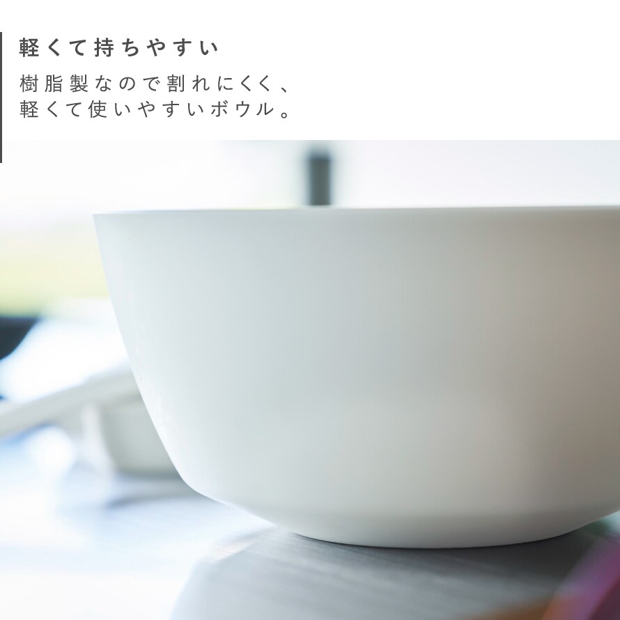 斜めに傾けて軽く手で持つだけで安定して混ぜやすい調理ボウルMサイズ。