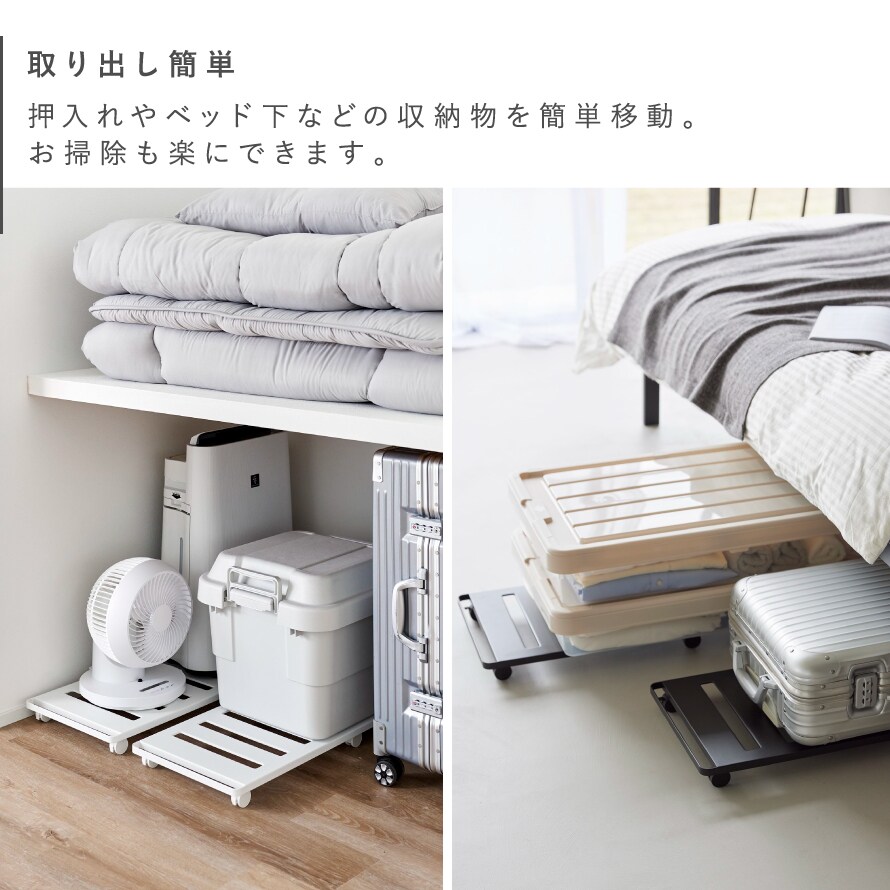 押入れやベッド下の収納に最適なロング台車。奥行き75cmのロングサイズで奥にある物をサッと取り出せ、お掃除もラクラク。