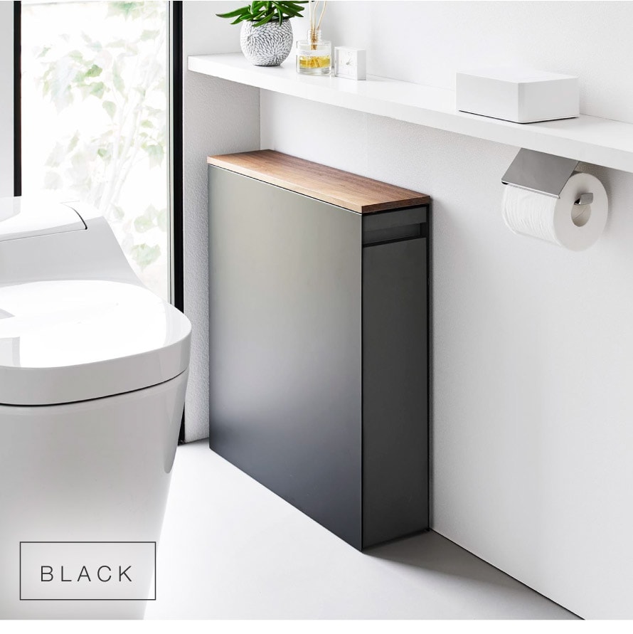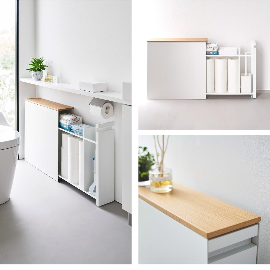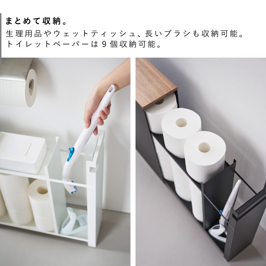 サニタリー用品やウェットティッシュ、長いトイレブラシも収納可能。トイレットペーパーは、9個入ります。