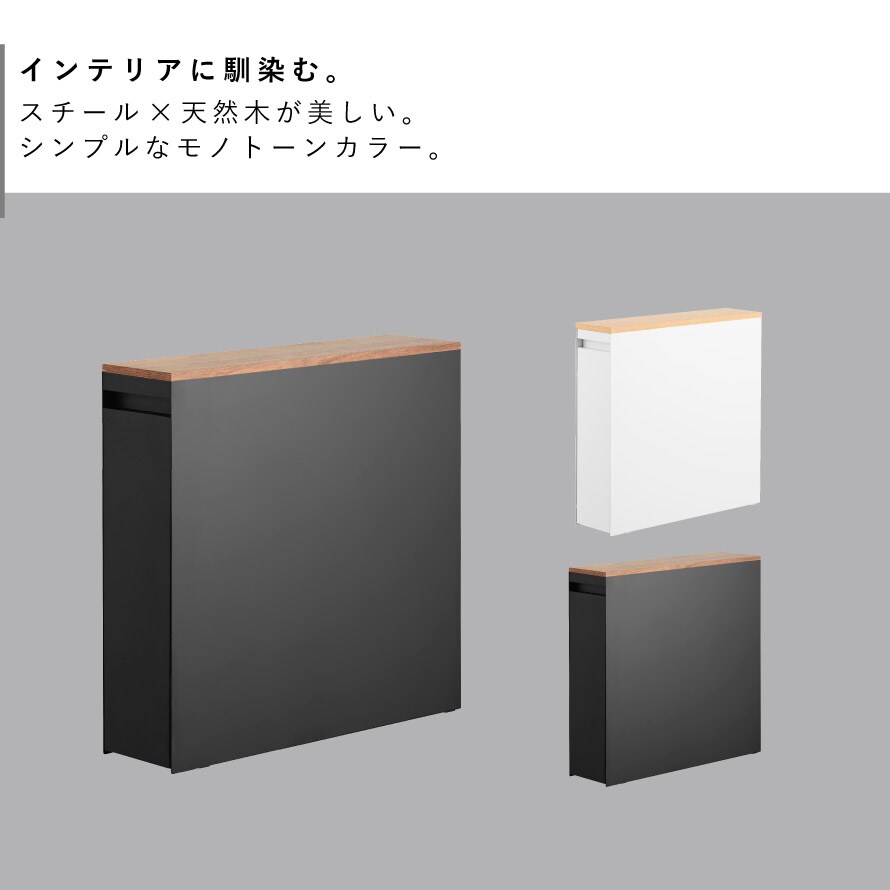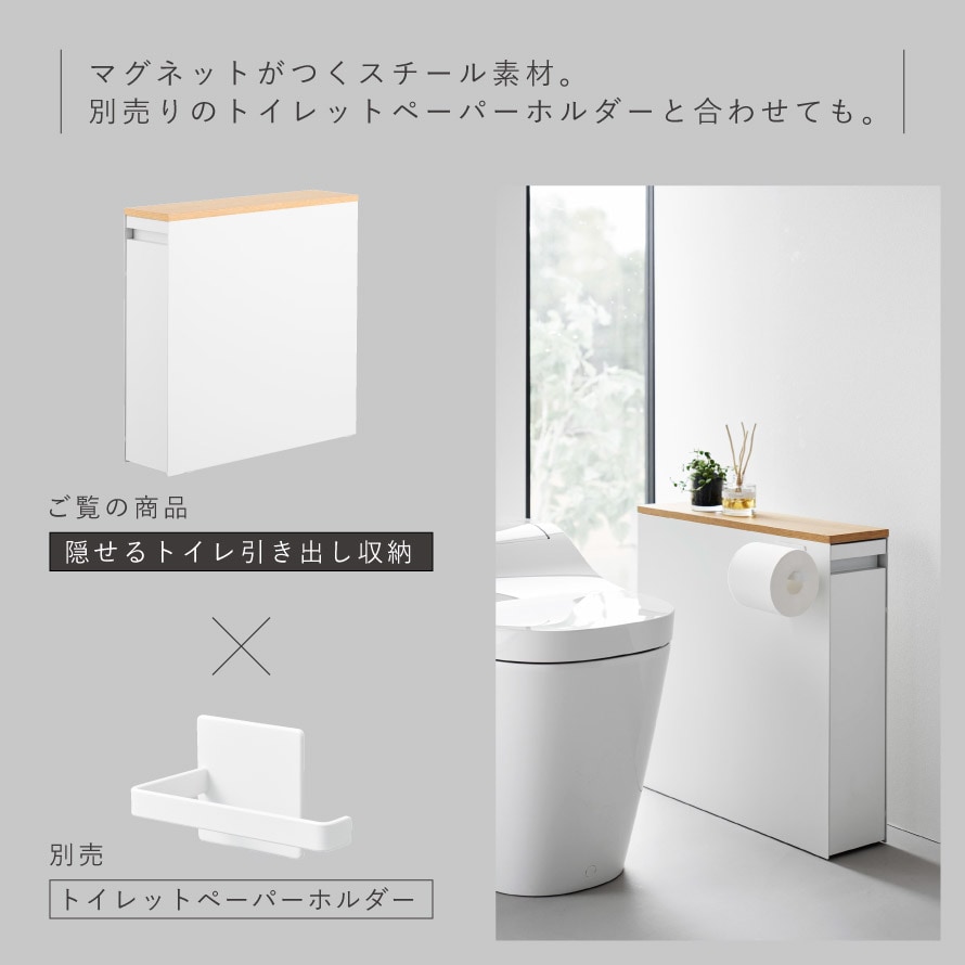 スチール製なので、側面に別売の「マグネットトイレットペーパーホルダー タワー」や棚など、マグネット商品を取り付けて収納を増やすことができます。