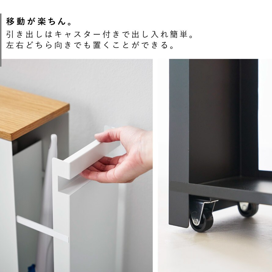 引き出しはキャスター付きで出し入れ簡単。トイレの空間に合わせて、左右どちら向きでも置くことができます。