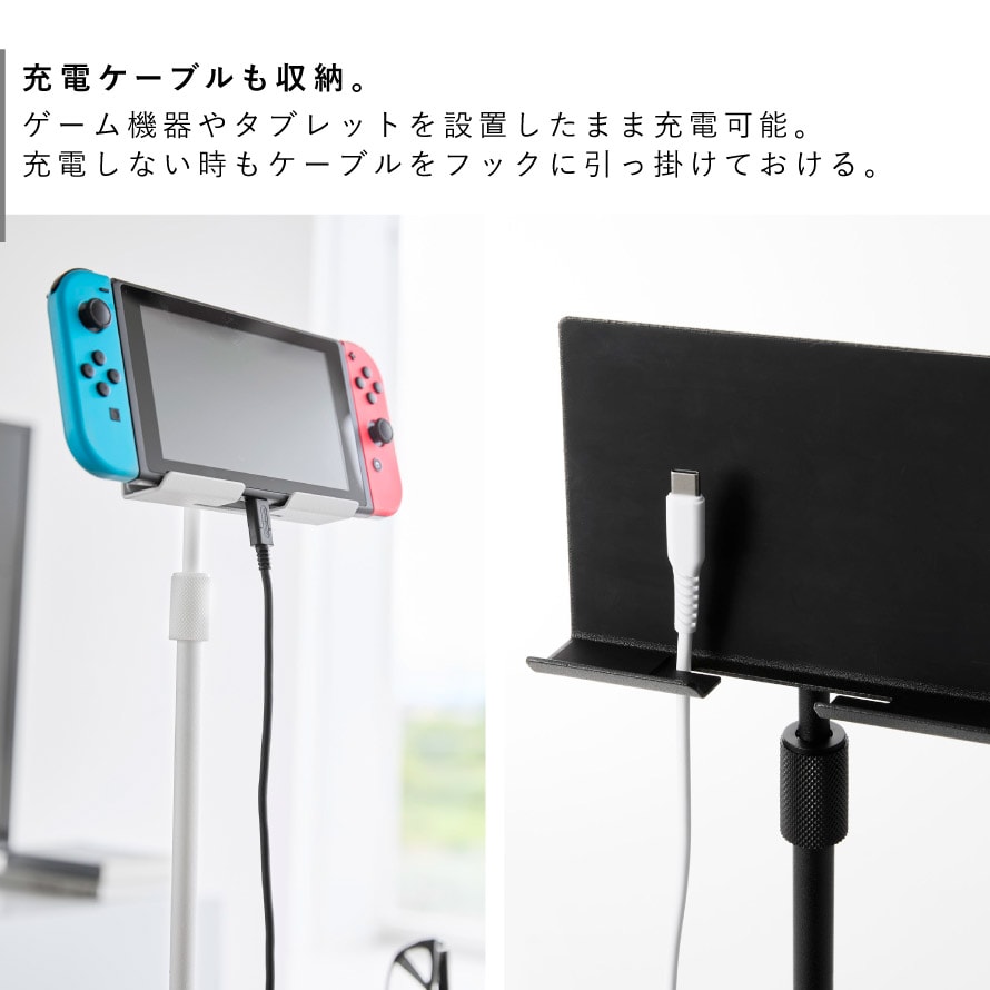 ゲーム機器やタブレットを設置したまま充電ができ、充電しない時には充電ケーブルをフックに引っ掛けておくことができるので便利です。