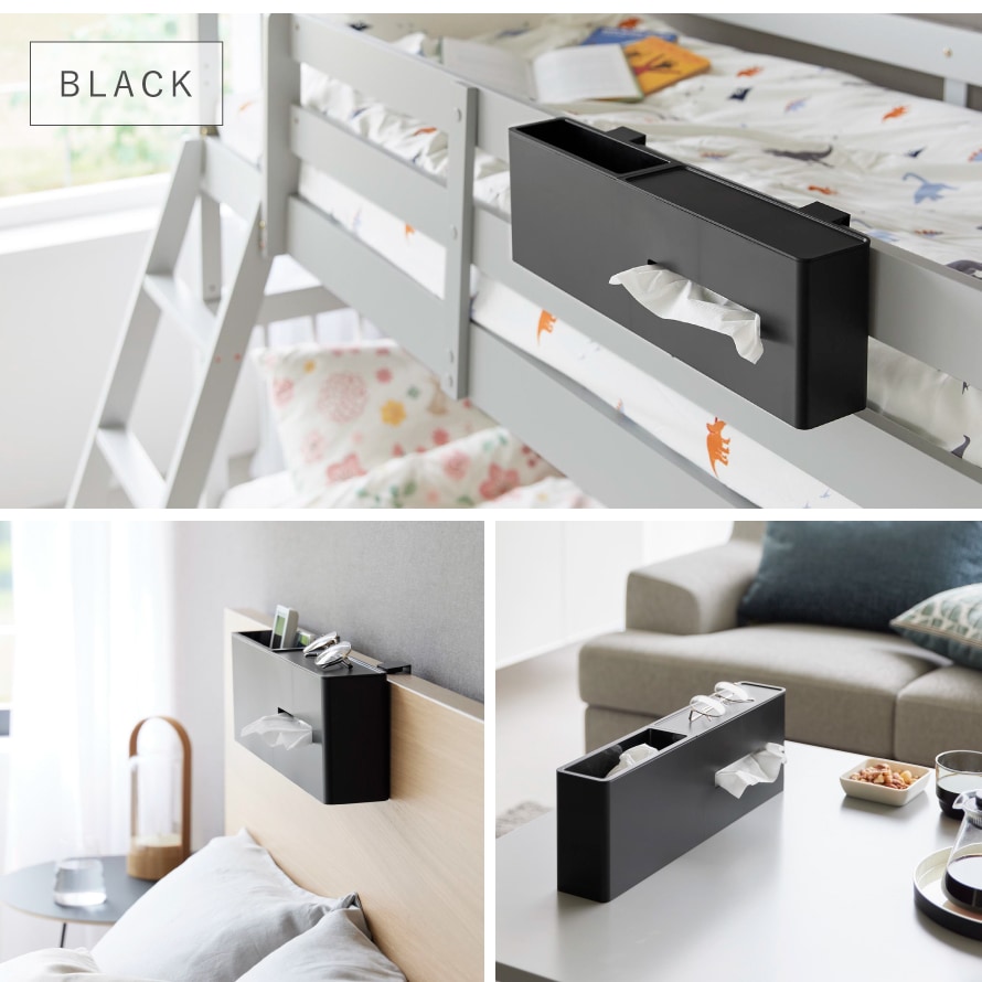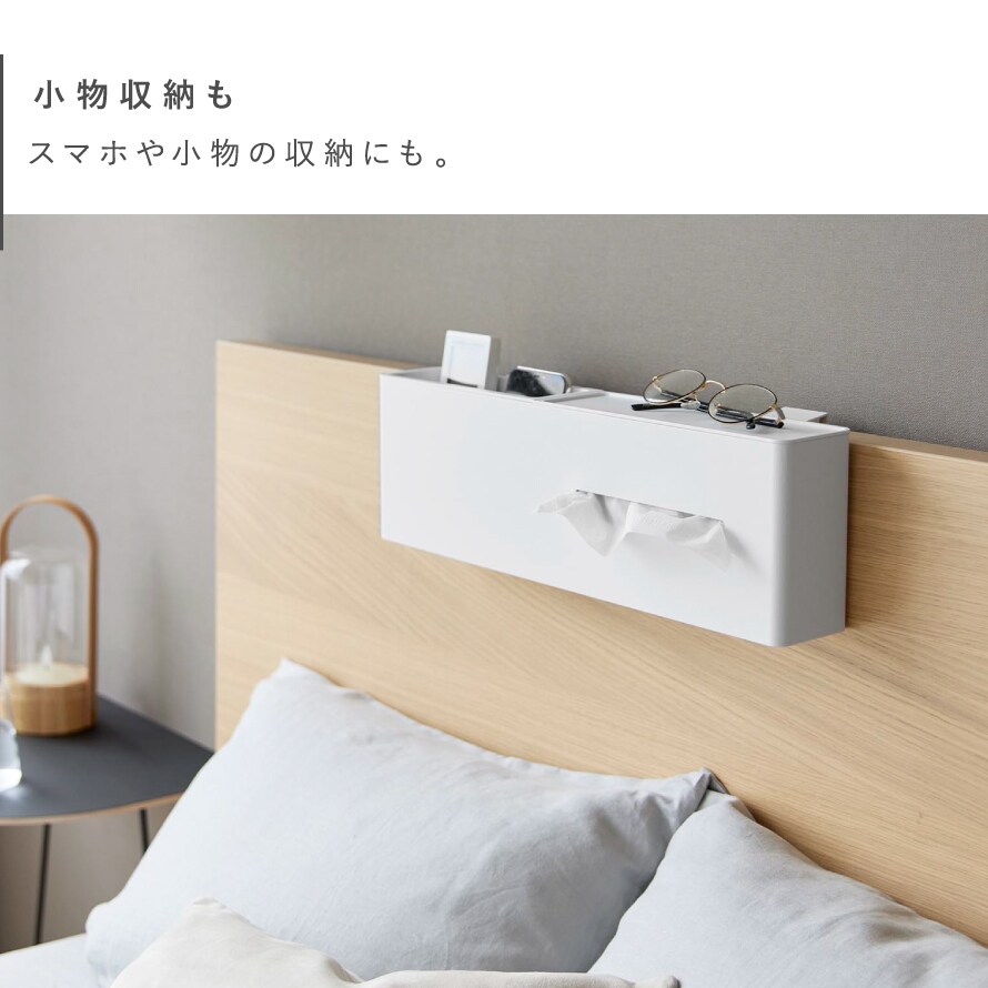 ティッシュケースの蓋はトレーにもなり、スマホの一時置きにも便利です。フックを取り付けずに、置き型として使用することもできます。ティッシュは箱ごと入れることができるため、交換もラクラク。