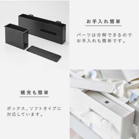 | 内寸 | ティッシュケース/幅24.4×奥行6.9×高さ12.9cm、トレー部/幅23.5×奥行6.7cm、ダストボックス(開口部)/幅18.5×奥行5.9×高さ13.8cm |