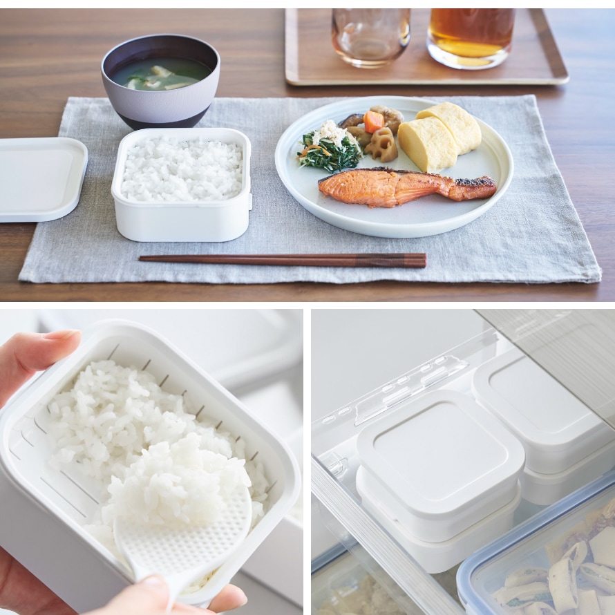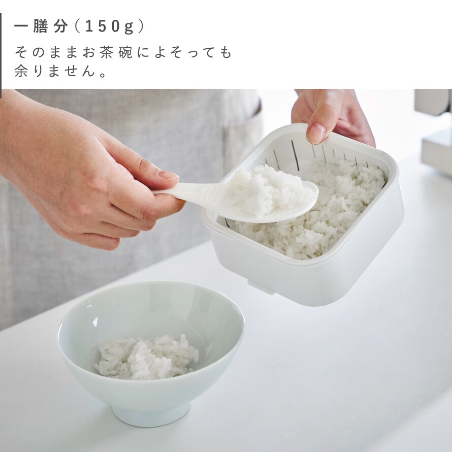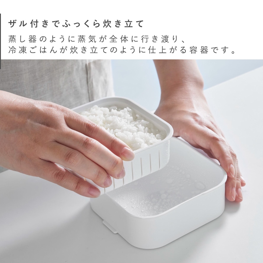 ザル付きなので、蒸し器のように蒸気が全体に行き渡り、温まりやすく一膳分(150g)の冷凍ごはんがふっくらと炊き立てのように仕上がる容器です。加熱した際の余分な水分を落とし、ごはんのべたつきを防ぎます。