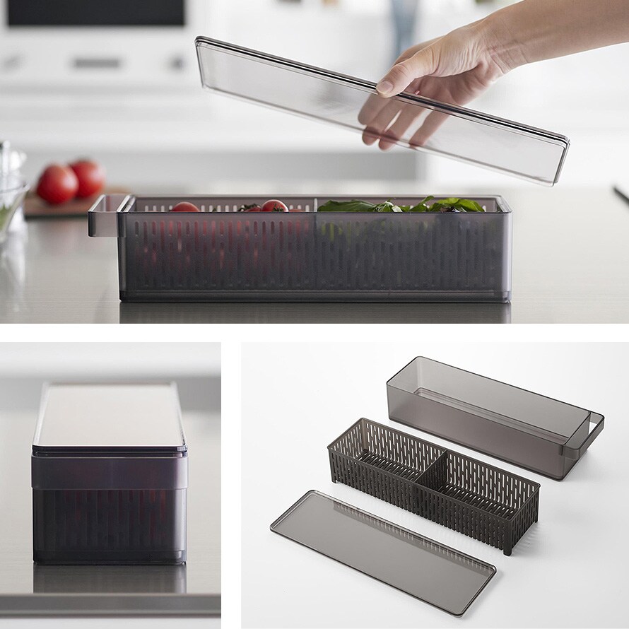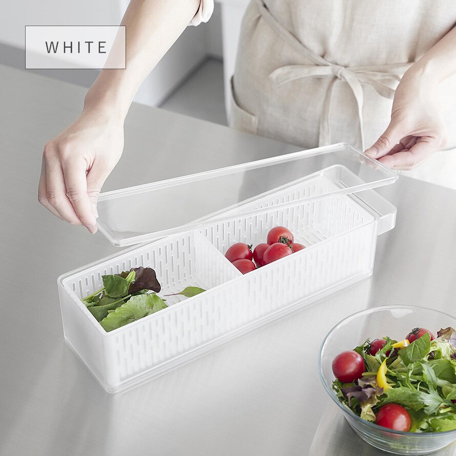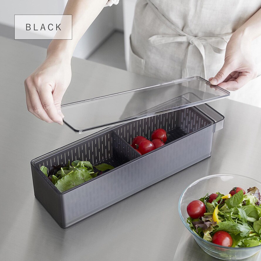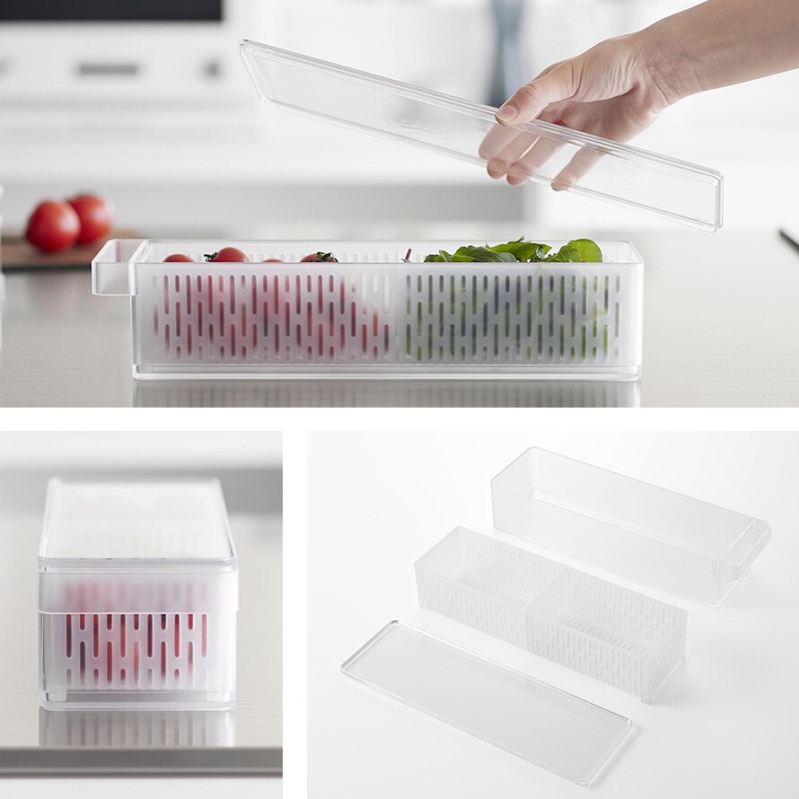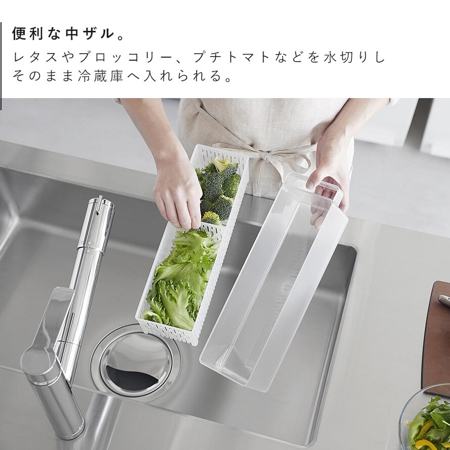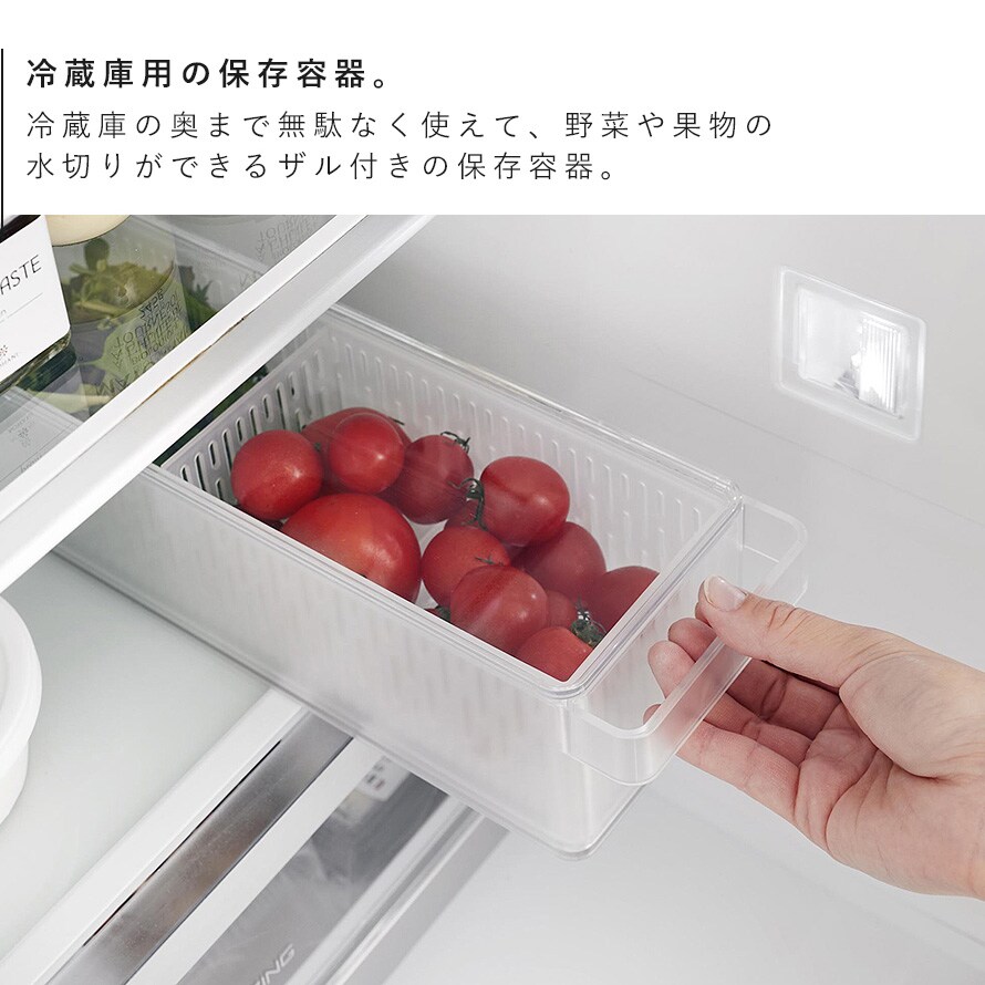 冷蔵庫の奥まで無駄なく使えて、プチトマトやレタスなどの野菜や果物の水切りができるザル付きの保存容器。