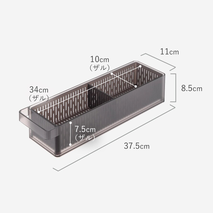| 内寸サイズ | 容器/開口部 幅34.5×奥行10.5×高さ7.5cm ザル/開口部 幅33.2×奥行9.5×高さ6.7cm(仕切りは5mm間隔で取り付け可能) |