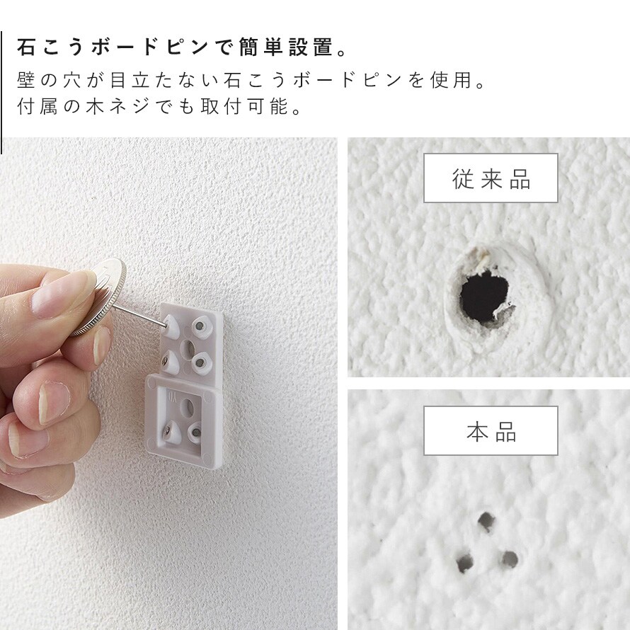 | 取り付け可能な壁 | 石こうボードピン使用時/壁紙・布壁紙・ビニール壁紙貼りなどの石こうボード・薄ベニヤ 木ネジ使用時/柱・板壁(厚さ1cm以上)・プリント合板(裏側に水平にサンがある場所)・裏側に下地材(間柱)が入っている壁 |