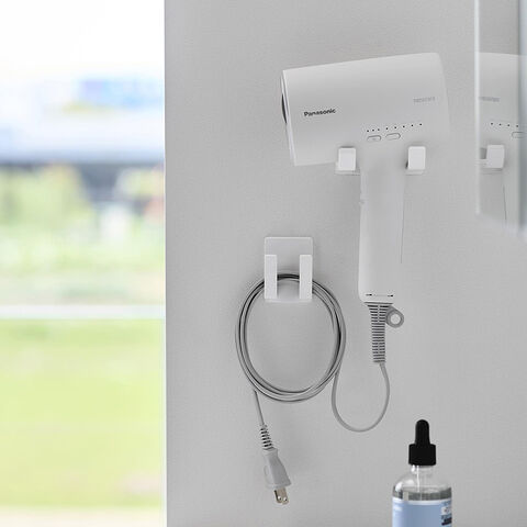 石こうボードピンで壁にドライヤーとコードを別々に収納できるホルダーです。
