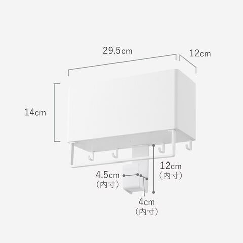 | 内寸サイズ | バスケット/幅29×奥行11.2×高さ13.7cm タオルバー/幅26×奥行1.2×高さ5.5cm ホースフック/幅4.5×奥行4×高さ11cm フック/幅0.6×奥行1.5×高さ2cm |