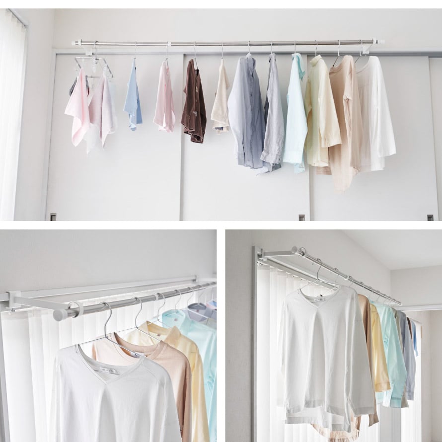 鴨居、窓枠など、お好みの位置に簡単取り付け。ポールを差し込むだけで室内物干し場ができます。