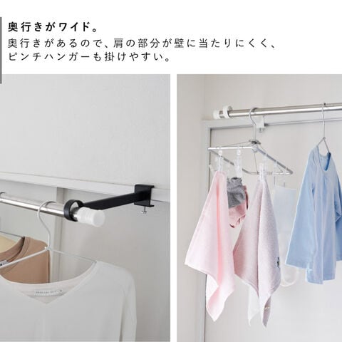 奥行きがあるので、スライド扉やカーテンを閉じた状態でも干せます。ピンチハンガーも掛けやすいです。洗濯物の肩の部分が壁やカーテンに当たりにくく、乾きムラになりにくいので◎。