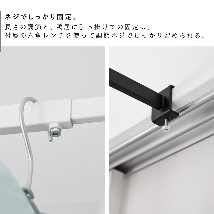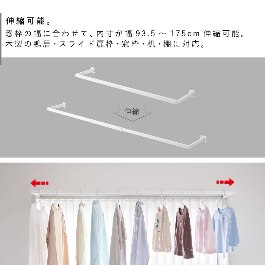 窓枠の幅に合わせて、内寸が幅93.5~175cm伸縮可能。木製の鴨居・スライド扉枠・窓枠・机・棚に対応しています。