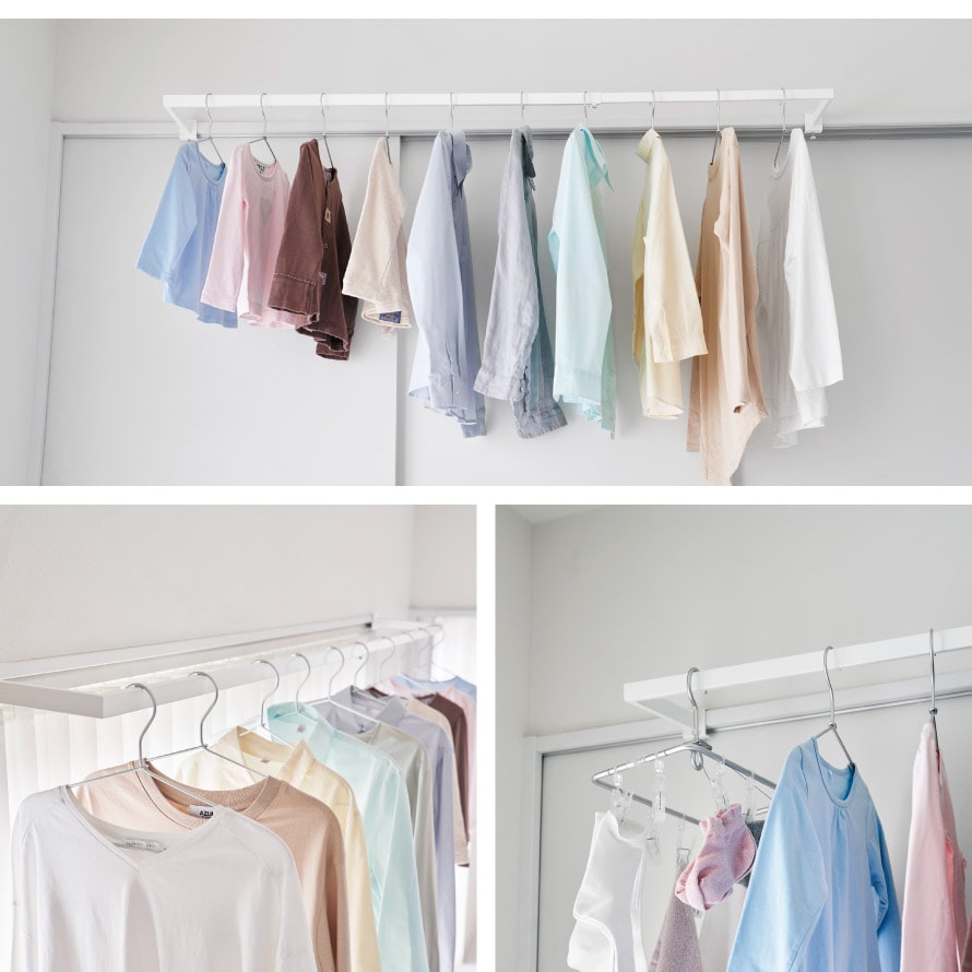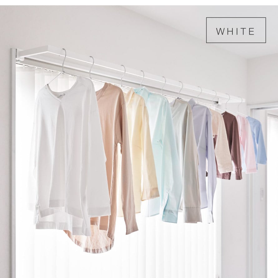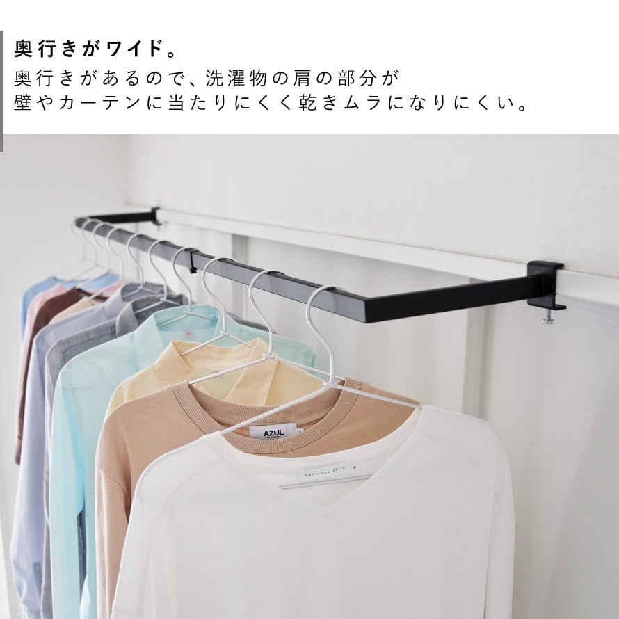 奥行きがあるので、スライド扉やカーテンを閉じた状態でも干せます。洗濯物の肩の部分が壁やカーテンに当たりにくく、乾きムラになりにくいので◎。