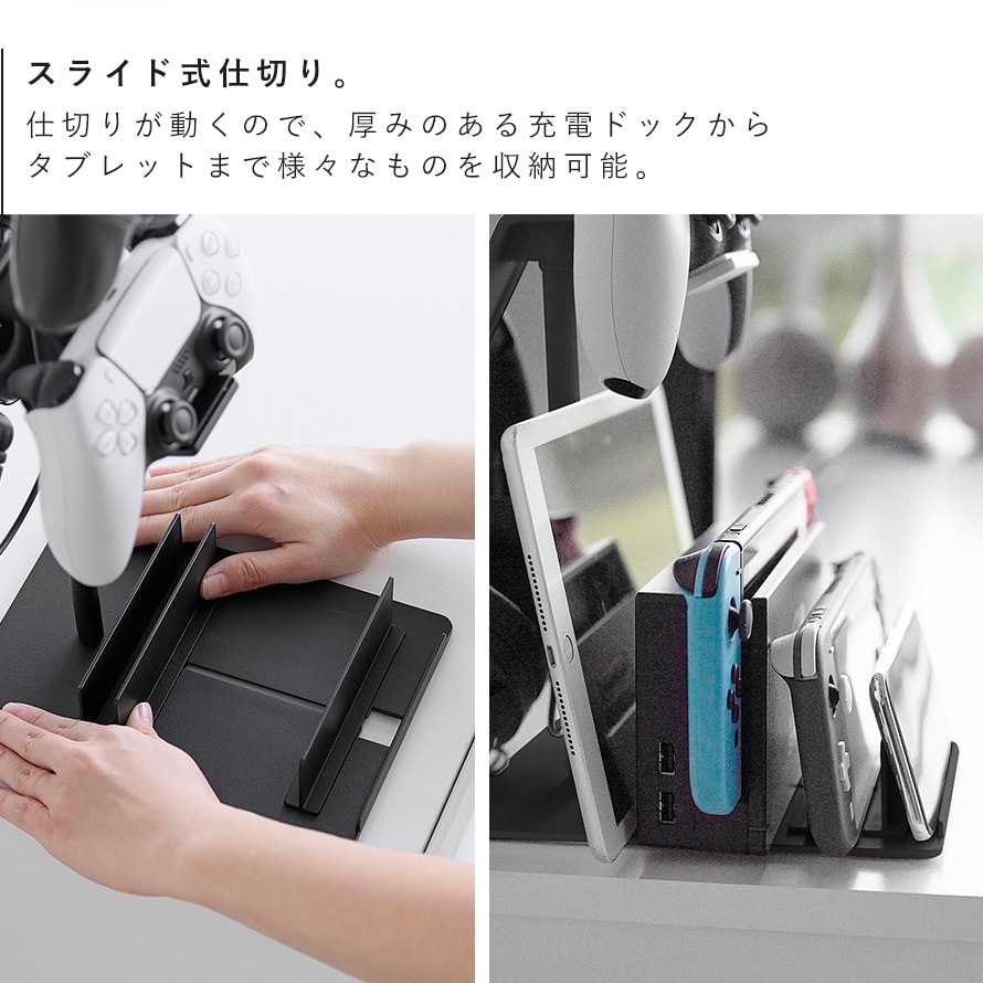仕切りが動くので厚みのある充電ドックや様々な小型ゲーム機、タブレットやスマホなどを立てて収納することができます。