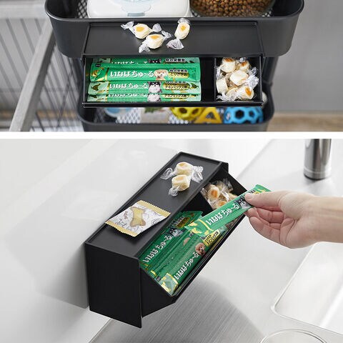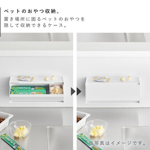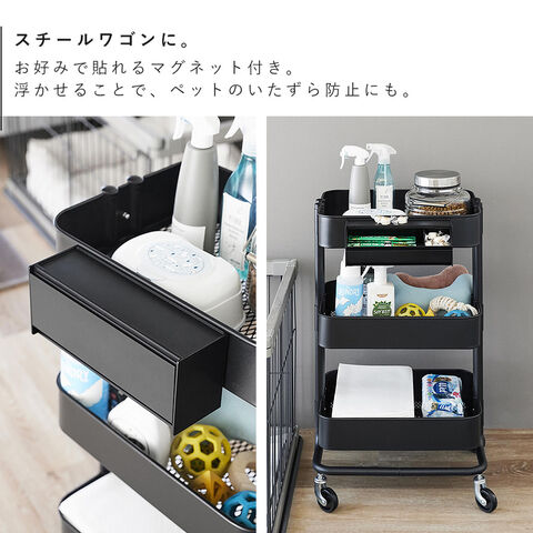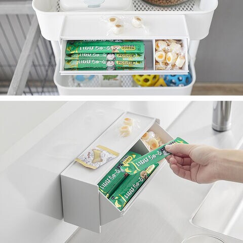 ペット用品をまとめた、マグネットが付くスチールワゴンの側面に設置すれば、おやつを浮かせて収納できるのでいたずら防止にも!