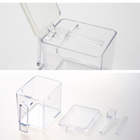 ストッカーは片手で開けられてそのままキープできるので便利。計量スプーンをすり切れる板付きです。